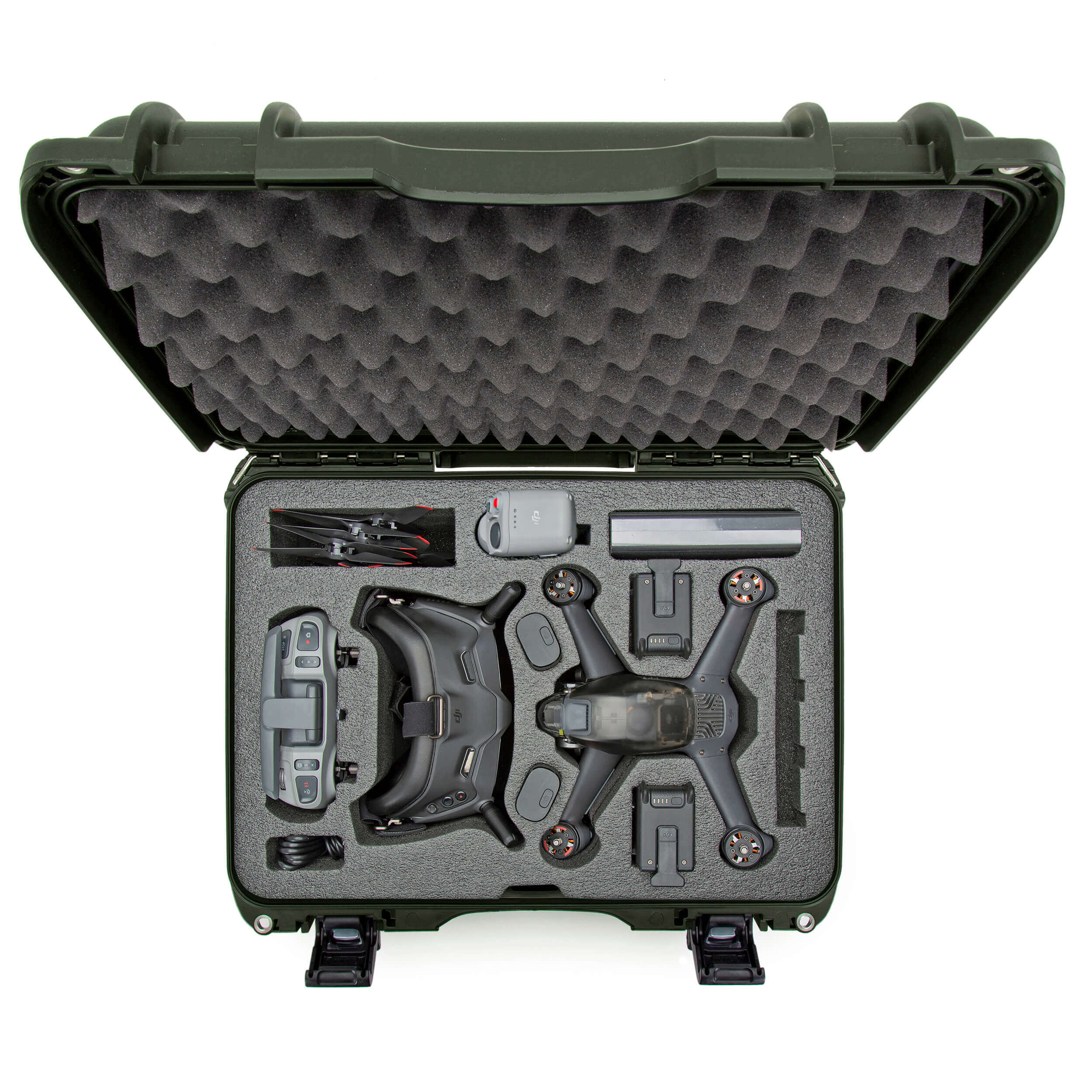 The closed-cell high-quality foam is pre-cut to fit your DJI FPV combo with the Gimbal Protector installed,FPV Remote Controller 2, DJI Motion Controller, and FPV Goggles V2 with the headband and antennas installed. The clever design also holds three (3) FPV Intelligent Flight Batteries, two (2) FPV Goggles batteries, AC Power Adapter, multiple cables (USB-C, Data, OTG), extra propellers, spare Control Sticks, and other charging accessories securely. Photographers, videographers, drone pilots, and enthusiasts trust NANUK to protect their FPV Drone Combo. Protect your investment.